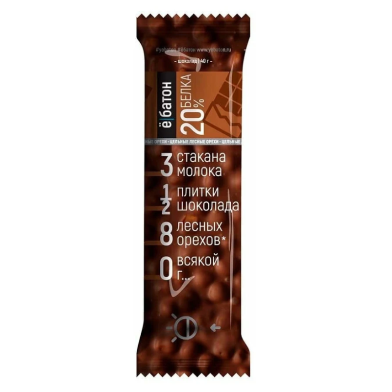 Ё|БАТОН, Протеиновый батончик 20 % белка, Шоколад-Лесной орех, 40 г