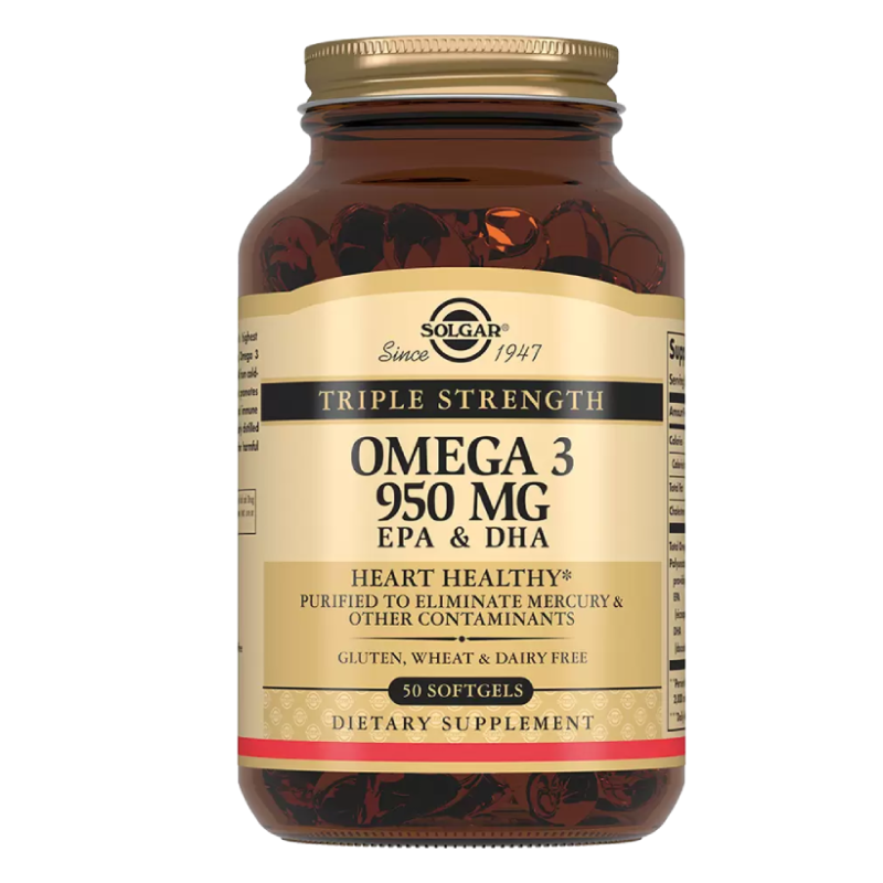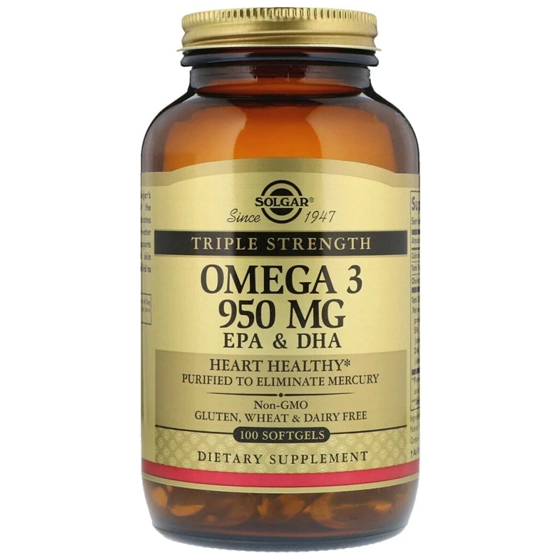 Солгар Тройная Омега-3 - биологически активная добавка (БАД) к пище, натуральный высококонцентрированный источник Омега-3 полиненасыщенных жирных кислот (ПНЖК) - докозагексаеновой (ДГК) и эйкозапентаеновой (ЭПК). Изготавливается на основе рыбьего жира высокого качества. Производится по уникальной технологии молекулярной дистилляции, методу, который позволяет удалить соли тяжелых металлов из рыбьего жира. Для защиты от окисления в каждую капсулу добавлен натуральный витамин Е. Из всех продуктов Солгар, содержащих жирные кислоты класса омега-3, "Тройная Омега-3" содержит самую высокую дозировку омега-3 ПНЖК - 950 мг. Жирные кислоты Омега-3 относятся к незаменимым (эссенциальным) жирным кислотам. Оказывают гиполипидемическое действие, снижая концентрацию триглицеридов и липопротеинов очень низкой плотности в плазме крови. Влияют на гемостаз, снижая синтез тромбоксана А2 и незначительно увеличивая время свертываемости крови. Способствуют защите зрения, улучшению работы головного мозга, иммунной системы, профилактике сердечно-сосудистых заболеваний.