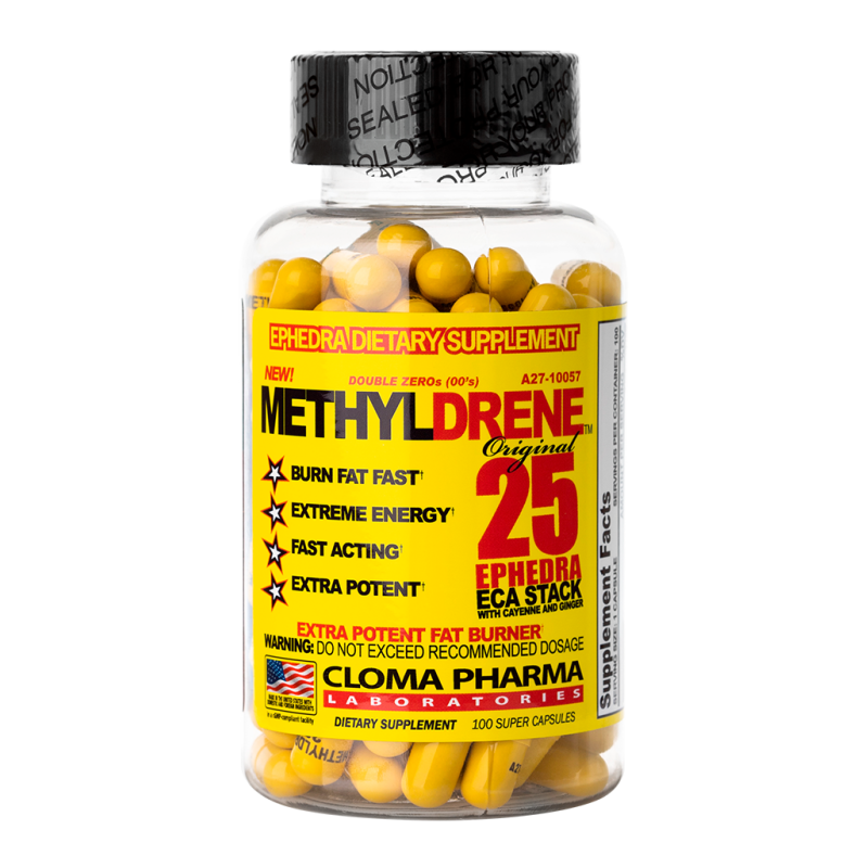 Methyldrene 25 от Cloma Pharma — спортивный жиросжигатель с экстрактом эфедры. Этот препарат очень эффективен и широко применяется для снижения веса в бодибилдинге, фитнесе и других видах спорта. В состав methyldrene cloma pharma (метилдрен клома фарма) входят три основных компонента: экстракт эфедры + безводный кофеин + аспирин. Данная комбинация также известна под аббревиатурой ЭКА. Она обладает синергическим эффектом, т.е. каждый компонент смеси усиливает действие другого и вместе они намного мощнее, чем каждый компонент в отдельности. Помимо ЭКА, Methyldrene 25 Cloma Pharma содержит целый набор других метаболических веществ, таких как витамины B6 и B12, экстракты йохимбе, женьшеня, зеленого чая, корня имбиря, теобромин, пиколинат хрома и некоторые другие. Эти вещества выступают не только в качестве метаболиков и термогеников, но и как стимуляторы ЦНС (женьшень, йохимбин, теобромин), антиоксиданты (зеленый чай). Стимулирующие действия выражаются в повышении мотивации, снятии утомления, тонизировании, т.е. помогают тренироваться дольше, сжигая за раз больше жира, что позволяет ЭКА работать дольше и эффективнее.