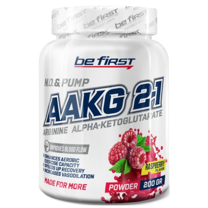 Что такое аргинин Аргинин – это протеиногенная аминокислота, которую относят к группе частично-заменимых аминокислот. Аргинин необходим для синтеза ряда белков. Наш организм вырабатывает аргинин, но только во взрослом возрасте: у детей и людей пожилого возраста аргинина вырабатывается очень мало, в связи с чем очень важно получать его из пищевых источников. Даже взрослый организм вырабатывает не слишком много аргинина, поэтому при активной физической деятельности (тяжелой работе, систематических тренировках и т.п.), а также при травмах, ожогах, резекции тонкой кишки и почечной недостаточности, потребность в аргинине сильно возрастает и эндогенного аргинина может не хватать. Be First AAKG 2:1 (Arginine alpha-ketoglutarate) содержит 2 молекулы аргинина, связанные с 1 молекулой альфа-кетоглутарата в идеальном соотношении 2:1. Что дает прием аргинина Be First AAKG 2:1 обеспечивает эффект пампинга и выступает как эффективный донатор азота. Его влияние проявляется как: улучшение кровоснабжения тканей мышц за счет расширения сосудов; усиленное питание мышц, повышающее работоспособность и скорость восстановления; быстрое выведение токсинов как следствие активизации кровотока; нормализация повышенного кровяного давления; улучшение половой функции; укрепление иммунитета. Хорошо себя показывает Be First AAKG 2:1 как в случае приема спортсменами-мужчинами, так и женщинами, поскольку основные механизмы действия аргинина практически не затрагивают работу гормональной системы.