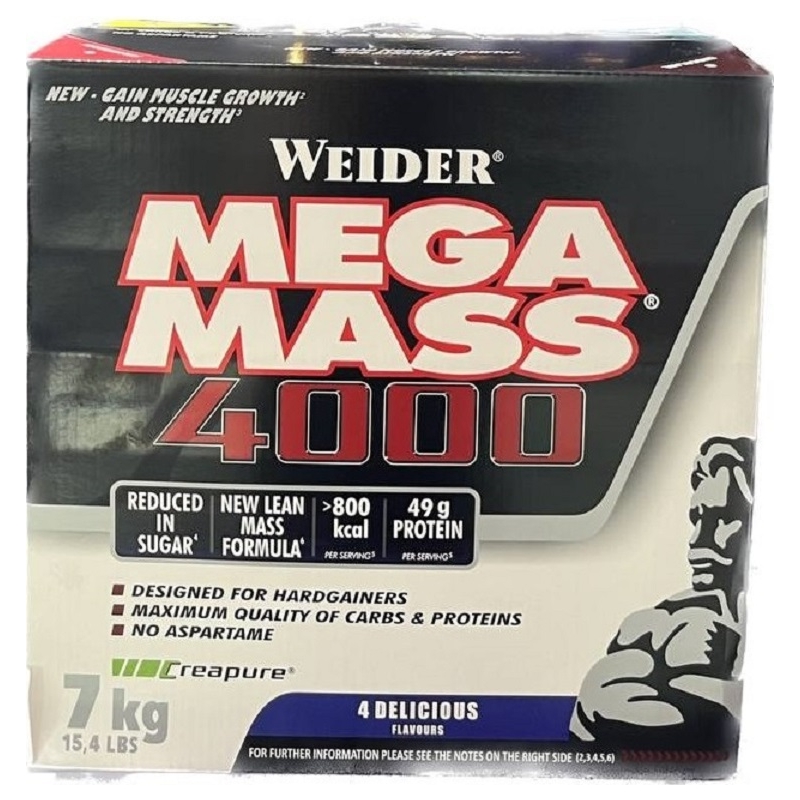 Mega Mass 4000 от Weider - специально созданный гейнер для тех, кому трудно набирать вес. Благодаря высокому содержанию углеводов различной длинны, вы будете обеспечены энергией на протяжении долгого времени на протяжении длительных и мощных тренировок. А изолят молочного белка вместе с большим количеством аминокислот BCAA полностью покроют потребности мускулатуры в питательных веществах и будут отличным строительным материалом для мышц. Гейнер Mega Mass 4000 Кроме того, в Weider Mega Mass 4000 содержится практически весь комплекс витаминов и минералов, необходимых каждый день организму. Гейнер Weider Mega Mass 4000 3 кг (около 20 порций) и Giant Mega Mass 4000 7 кг (около 46 порций): Mega Mass 4000 3 кгMega Mass 4000 7 кг Weider Mega Mass 4000 - уникальный продукт, способствующий быстрому набору веса!