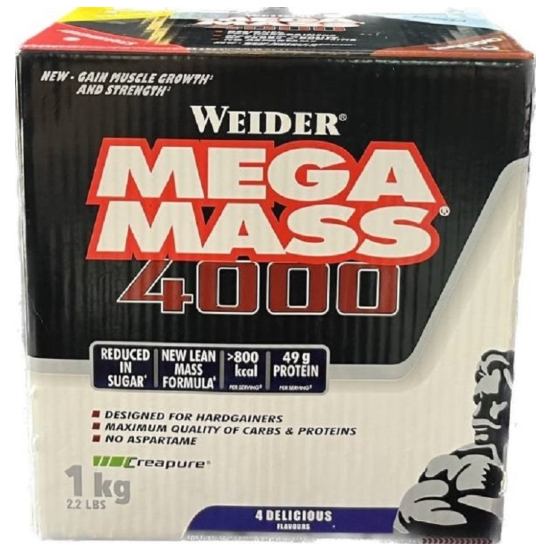 Mega Mass 4000 от Weider - специально созданный гейнер для тех, кому трудно набирать вес. Благодаря высокому содержанию углеводов различной длинны, вы будете обеспечены энергией на протяжении долгого времени на протяжении длительных и мощных тренировок. А изолят молочного белка вместе с большим количеством аминокислот BCAA полностью покроют потребности мускулатуры в питательных веществах и будут отличным строительным материалом для мышц. Гейнер Mega Mass 4000 Кроме того, в Weider Mega Mass 4000 содержится практически весь комплекс витаминов и минералов, необходимых каждый день организму. Гейнер Weider Mega Mass 4000 3 кг (около 20 порций) и Giant Mega Mass 4000 7 кг (около 46 порций): Mega Mass 4000 3 кгMega Mass 4000 7 кг Weider Mega Mass 4000 - уникальный продукт, способствующий быстрому набору веса!